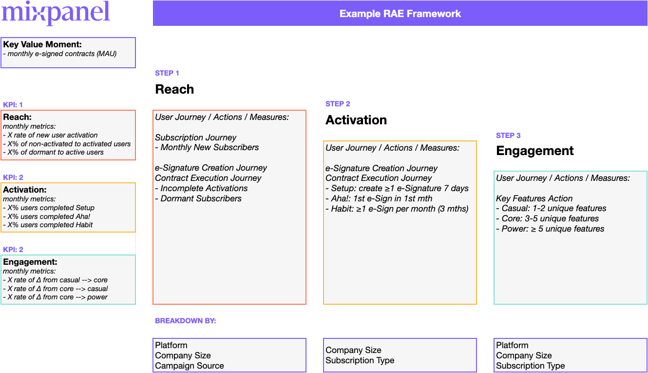 For customers new to product analytics, we’d like to recommend a simple RAE framework to hone in on your 2-3 key metrics / KPIs. RAE stands for Reach, Activation, and Engagement. Using this framework, you can quickly identify the key events and properties you need to start measuring your KPIs. This framework also translates into a clearly defined funnel or sequence of events that monitors your product’s reach, to enabling user activation, and finally tracking the level of your users’ engagement.
